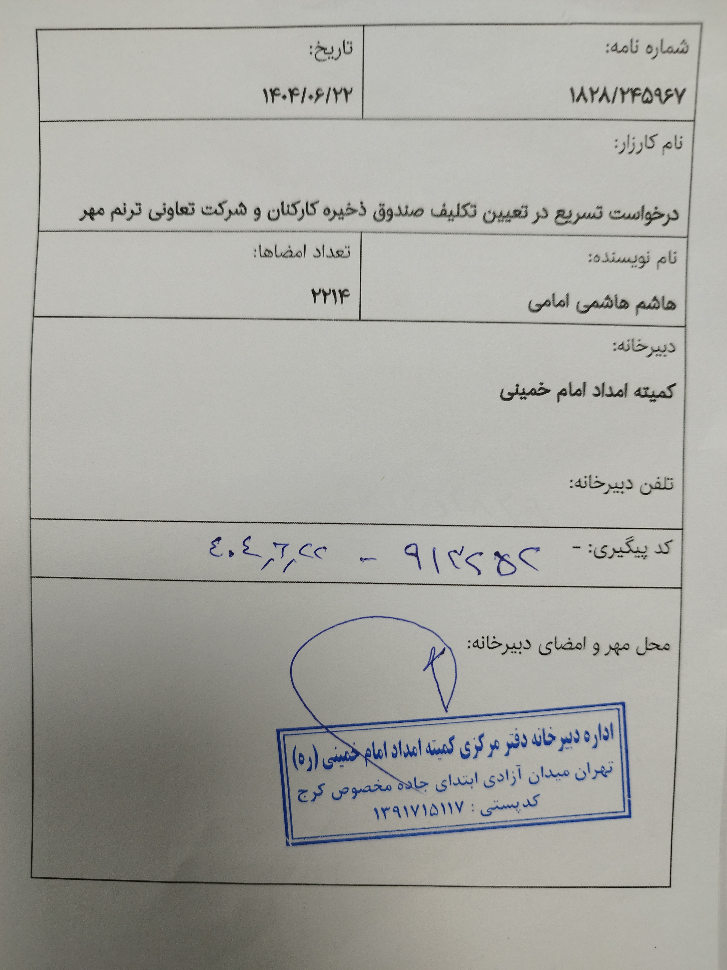 موضوع: تعیین تکلیف سهامداران شرکت تعاونی ترنم مهر و اعضای صندوق ذخیره کارکنان امداد