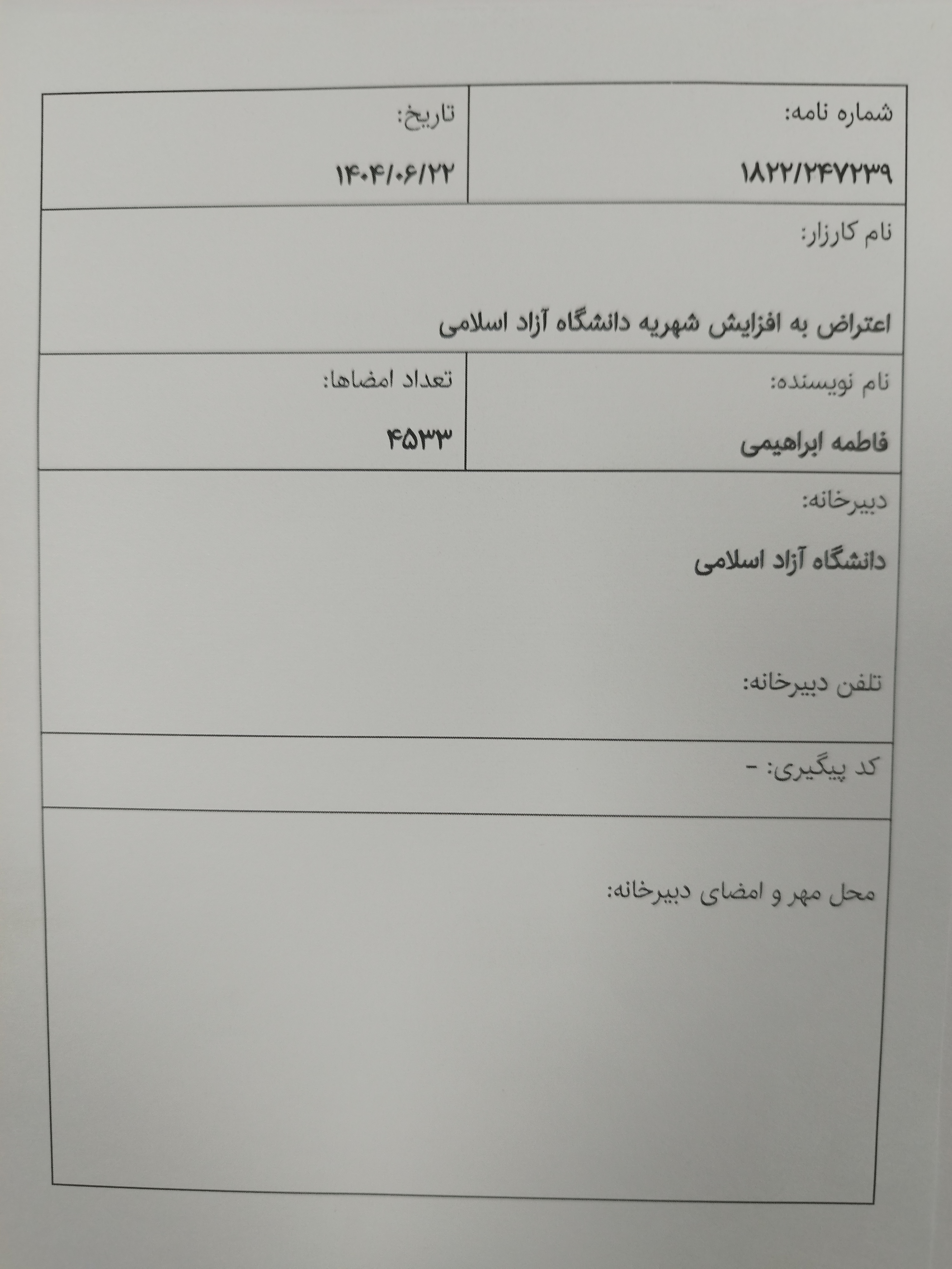 ما جمعی از دانشجویان دانشگاه آزاد اسلامی، نسبت به افزایش شهریه از ترم هشتم به بعد، اعتراض خود را به صورت رسمی اعلام میداریم.