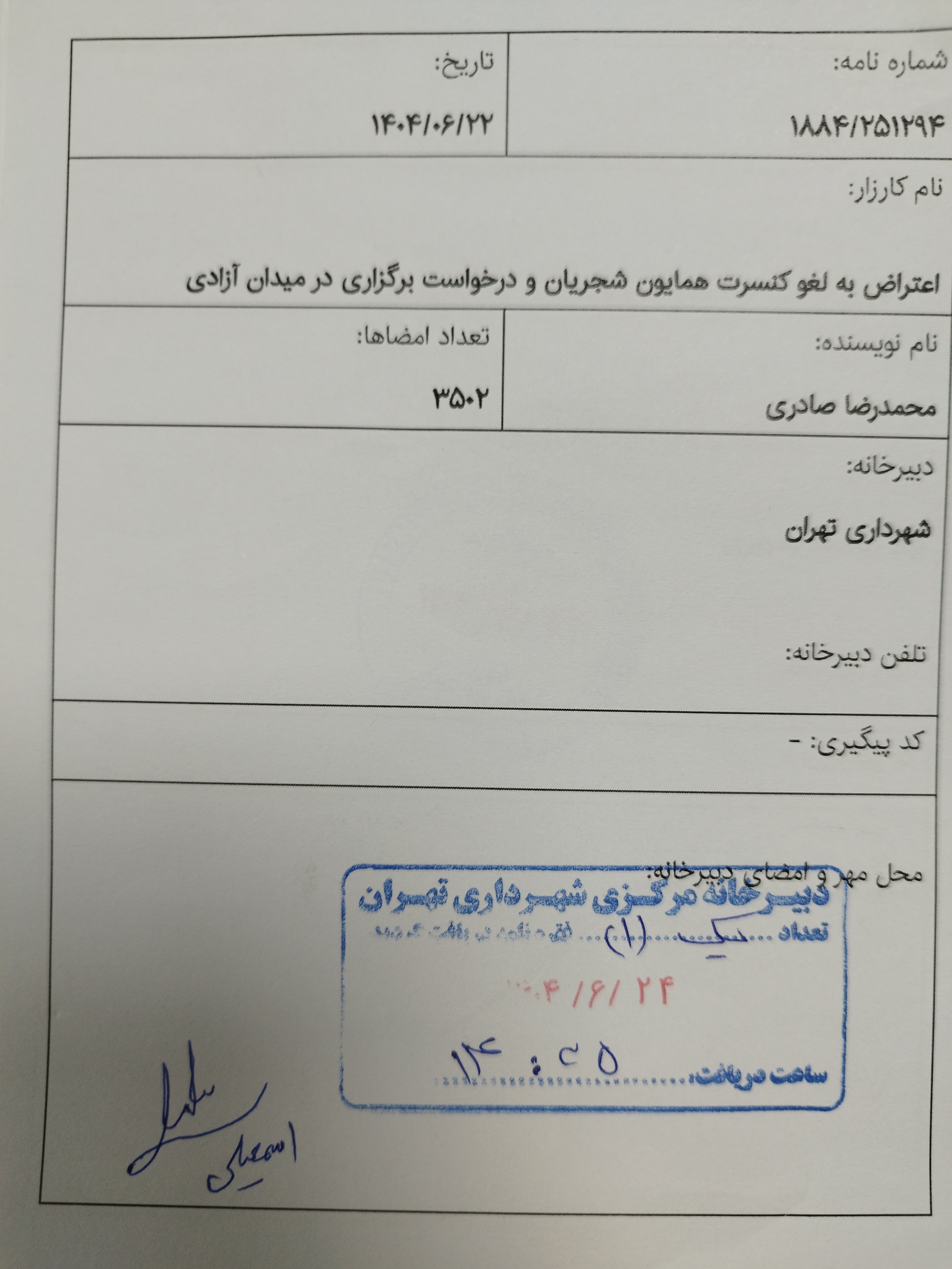 ما جمعی از شهروندان و علاقهمندان فرهنگ و هنر ایران، نسبت به لغو کنسرت رایگان آثار فاخر و ملی همایون شجریان اعتراض داریم. موسیقی اصیل ایرانی نهتنها بخشی از هویت فرهنگی و تاریخی این سرزمین است، بلکه میتواند در شرایط حساس امروز، نقش مهمی در تقویت وحدت ملی و امید اجتماعی ایفا کند.