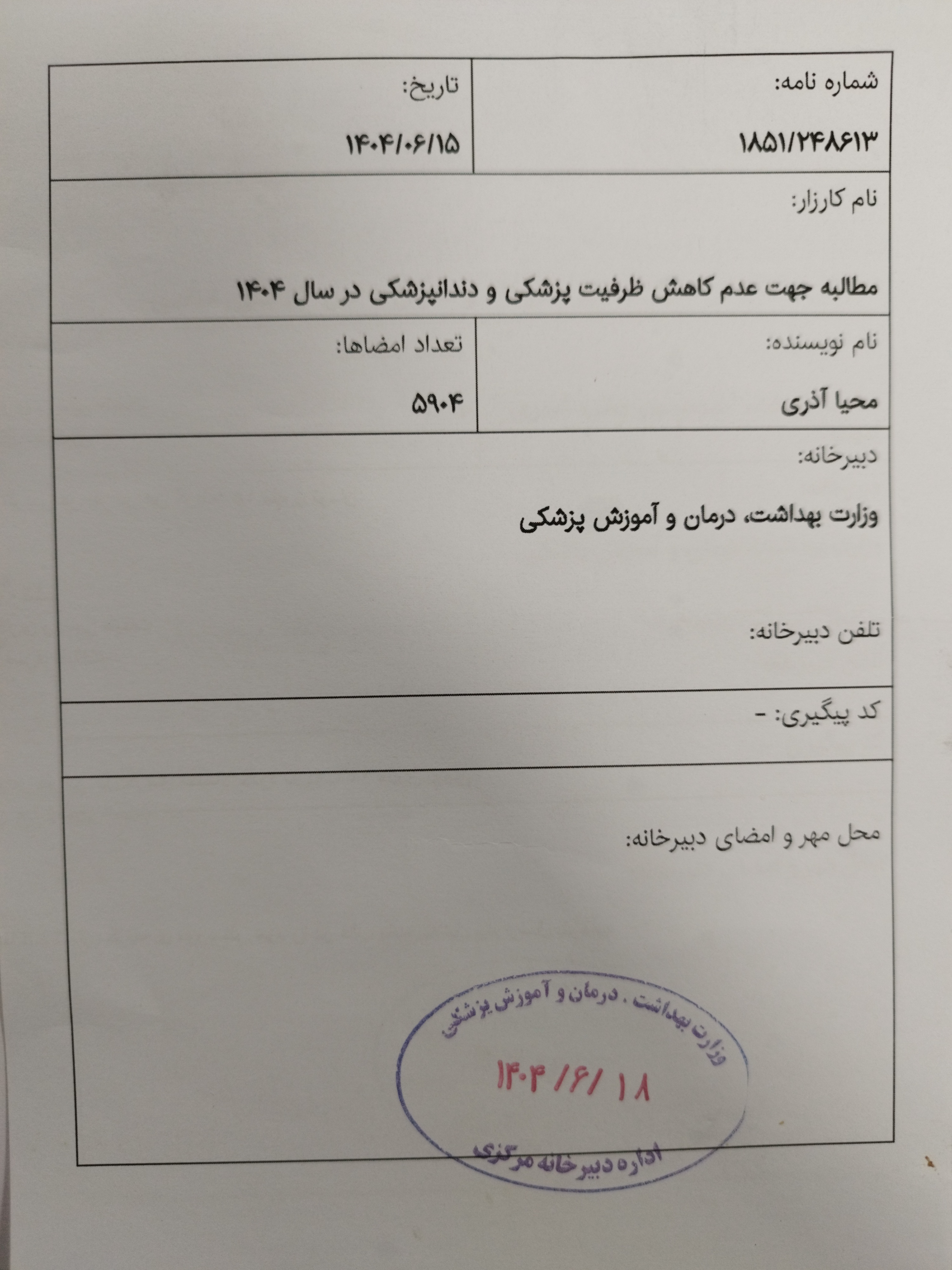 این کارزار در دبیرخانه وزارت بهداشت، درمان و آموزش پزشکی ثبت شد.