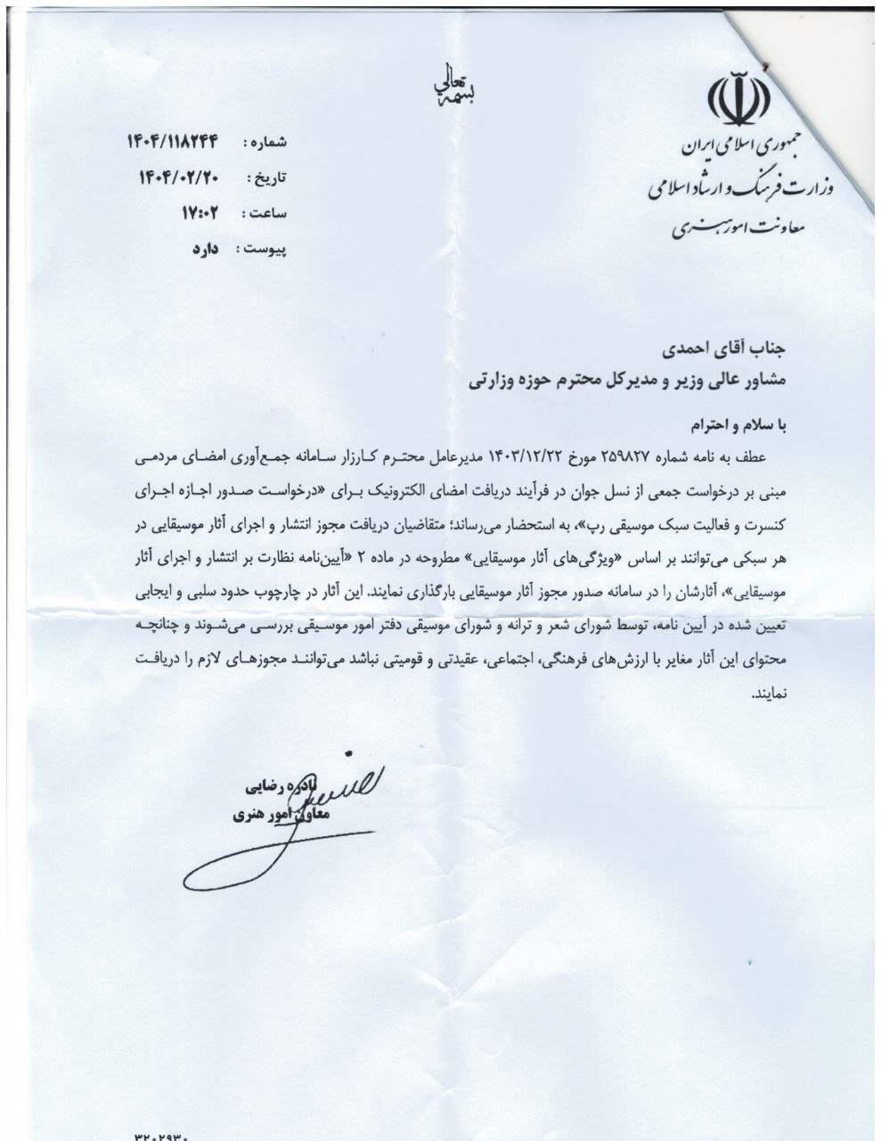 پاسخ وزارت ارشاد به درخواست صدور اجازه فعالیت سبک موسیقی رپ