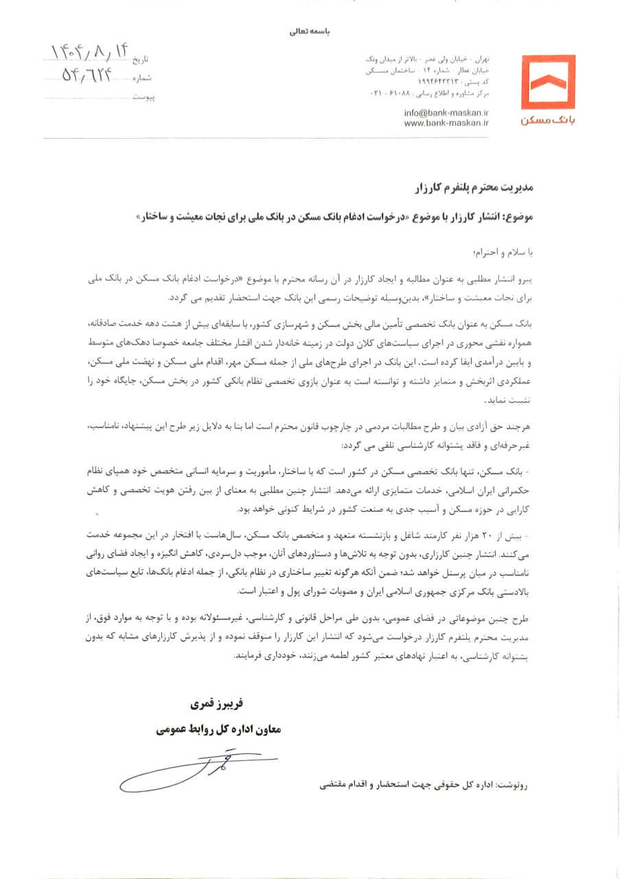 پاسخ بانک مسکن به کارزار «درخواست ادغام بانک مسکن با بانک ملی برای نجات معیشت و ساختار»