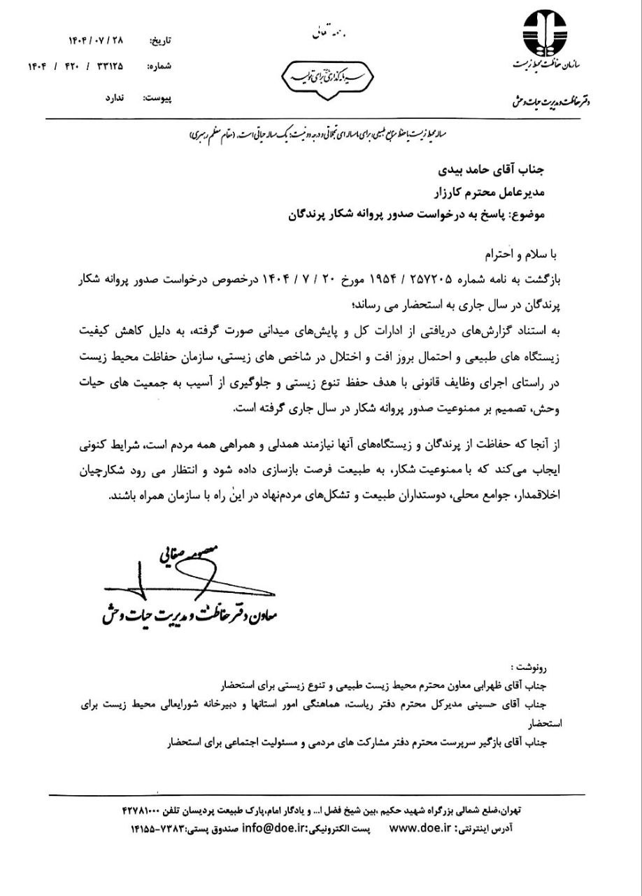 پاسخ رسمی سازمان محیط زیست به کارزار «درخواست صدور پروانه شکار پرندگان ۱۴۰۴»